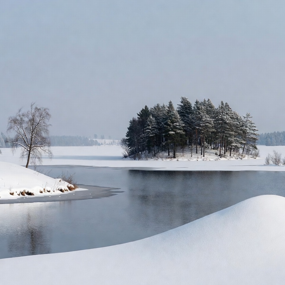 A small island covered in snow features a cluster of pine trees in the center of a frozen lake. Snowy hills and a lone birch tree stand in the foreground under a clear blue sky. The landscape is serene with ice along the water's edges.