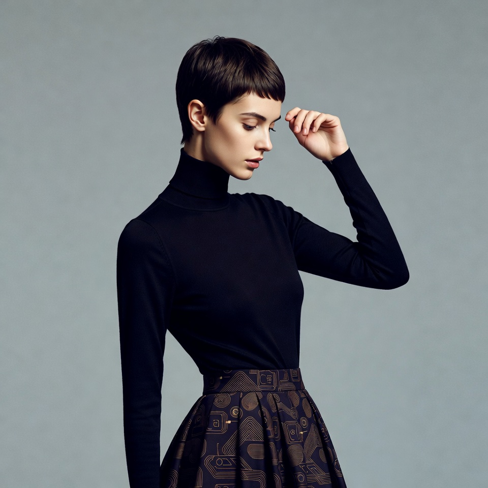 A young woman with a short pixie haircut poses in profile against a gray background. She wears a black high-neck sweater and a patterned skirt with geometric designs. Her hand touches her face thoughtfully.