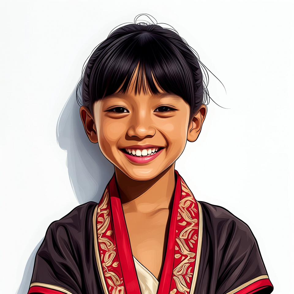 Asian, Asian clothing, Asian girl, bangs, black hair, cheerful expression, child portrait, digital art, embroidered kimono, female, happy face, illustration, kimono, portrait, red trim, smiling girl, traditional clothing, white background, young girl, girl