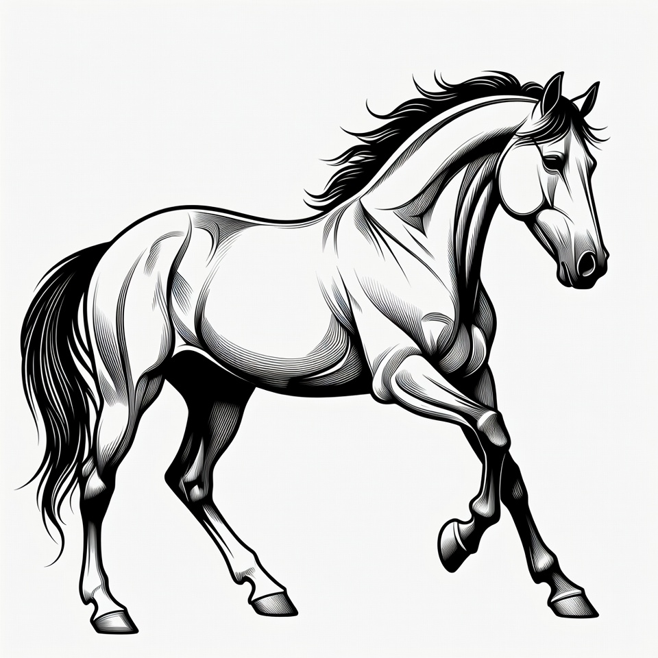 animal, black and white, detailed sketch, equine, flowing mane, galloping horse, illustration, ink drawing, isolated background, line art, mane, running horse, stallion, tail, vector art, horse