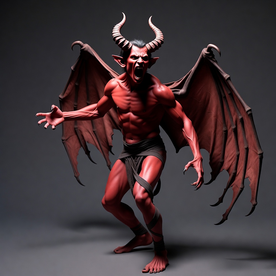 3D render, aggressive pose, bat wings, claws, dark background, devil, fangs, fantasy creature, horns, illustration, isolated background, loincloth, muscular, red demon, roaring, demon