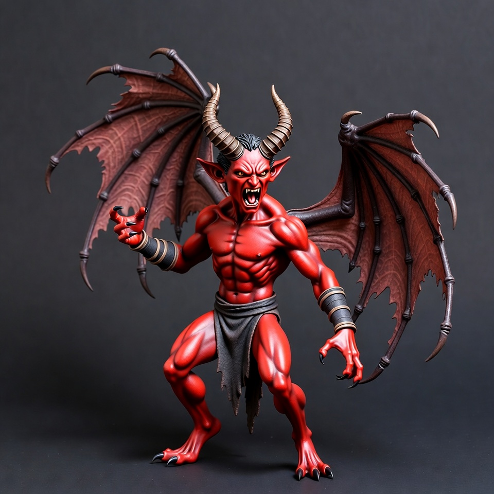 arm bands, bat wings, black background, claws, devil, digital art, evil, fangs, fantasy creature, horns, horns, illustration, loincloth, monster, muscular, red demon, roaring, snarling, wings, demon