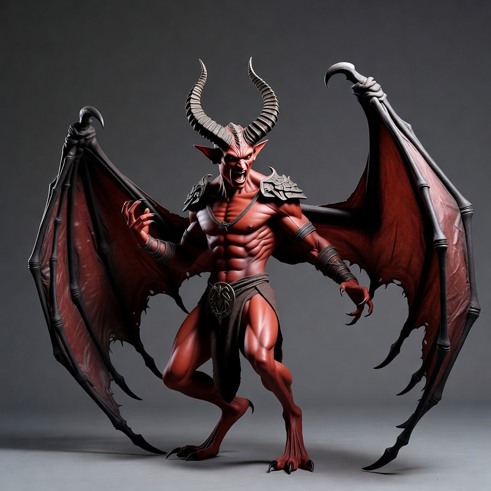 3D render, armor straps, bat wings, claws, curved horns, dark background, demonic, devil, fangs, fantasy creature, fierce pose, horns, illustration, muscular, mythical beast, red demon, sculpted body, sharp teeth, wings spread, demon