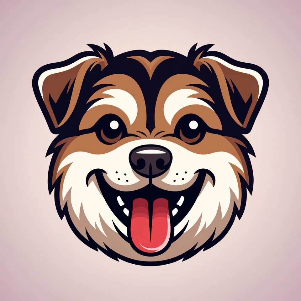 A vibrant cartoon illustration of a husky dog's face with brown, white, and black fur. The dog has large expressive eyes, a black nose, and a wide open mouth showing its tongue in a happy smile. It features bold outlines and is set against a solid pinkish-purple background.