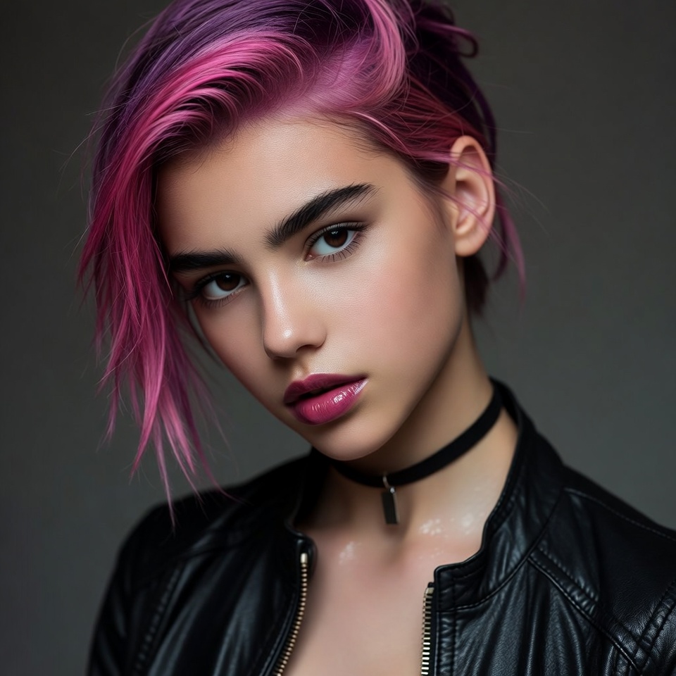 arched eyebrows, black choker, closeup, dark background, direct gaze, edgy look, female, glossy lips, leather jacket, pink hair, portrait, short hairstyle, stylish hair, undercut, vibrant pink, young woman, woman