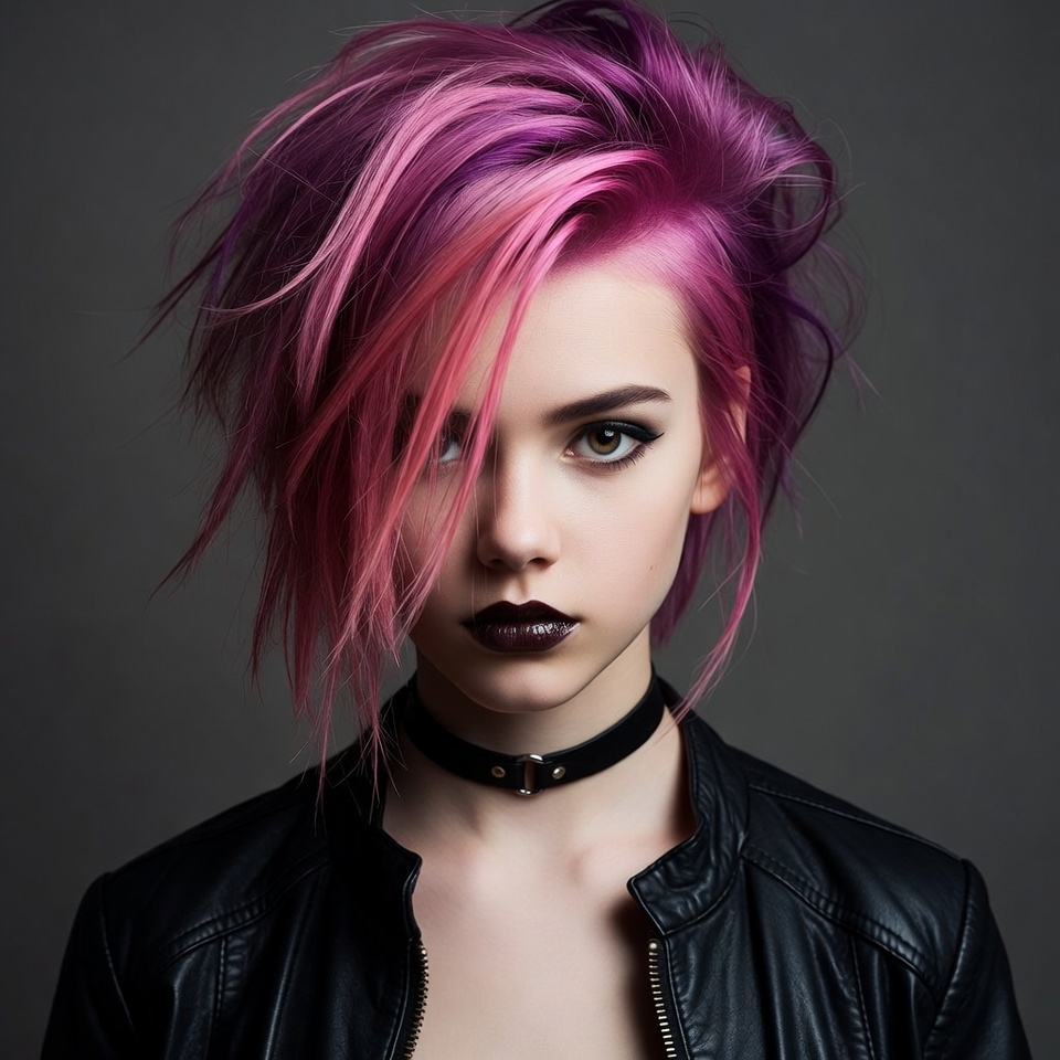 A young woman with vibrant pink and purple spiked hair stares directly at the camera. She has dark eyeliner, black lipstick, and wears a black choker necklace with a metal ring. She is dressed in a black leather jacket against a plain gray background.