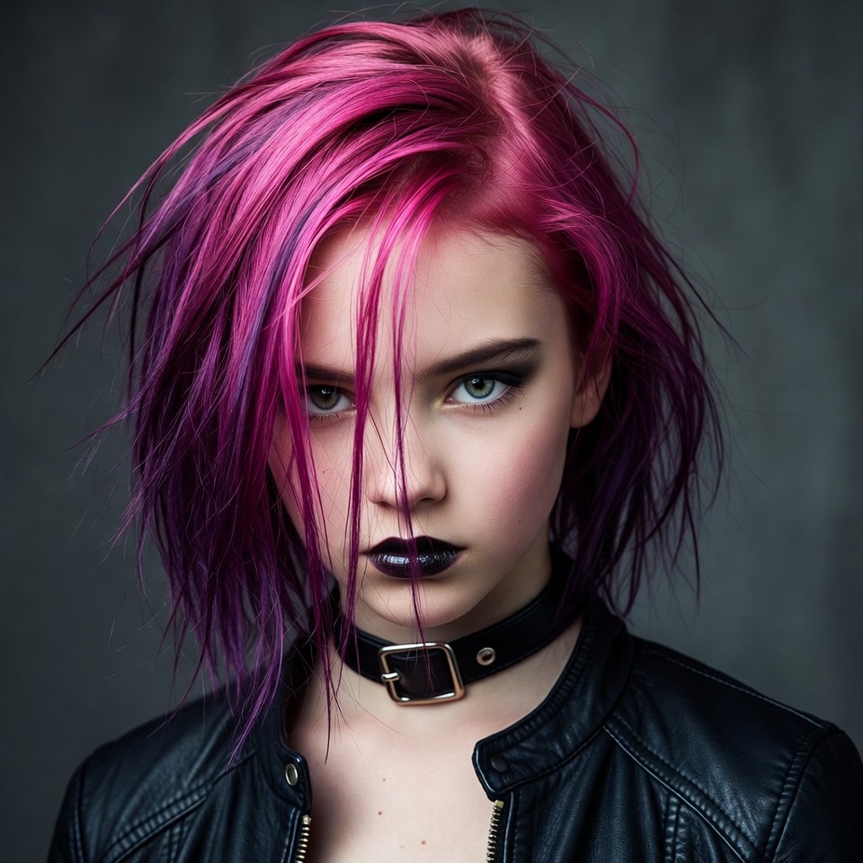 White, black choker, choppy hair, dark makeup, edgy look, female, goth makeup, green eyes, intense gaze, leather choker, leather jacket, pale skin, pink hair, punk hairstyle, purple lipstick, studio portrait, vibrant hair, young woman, woman