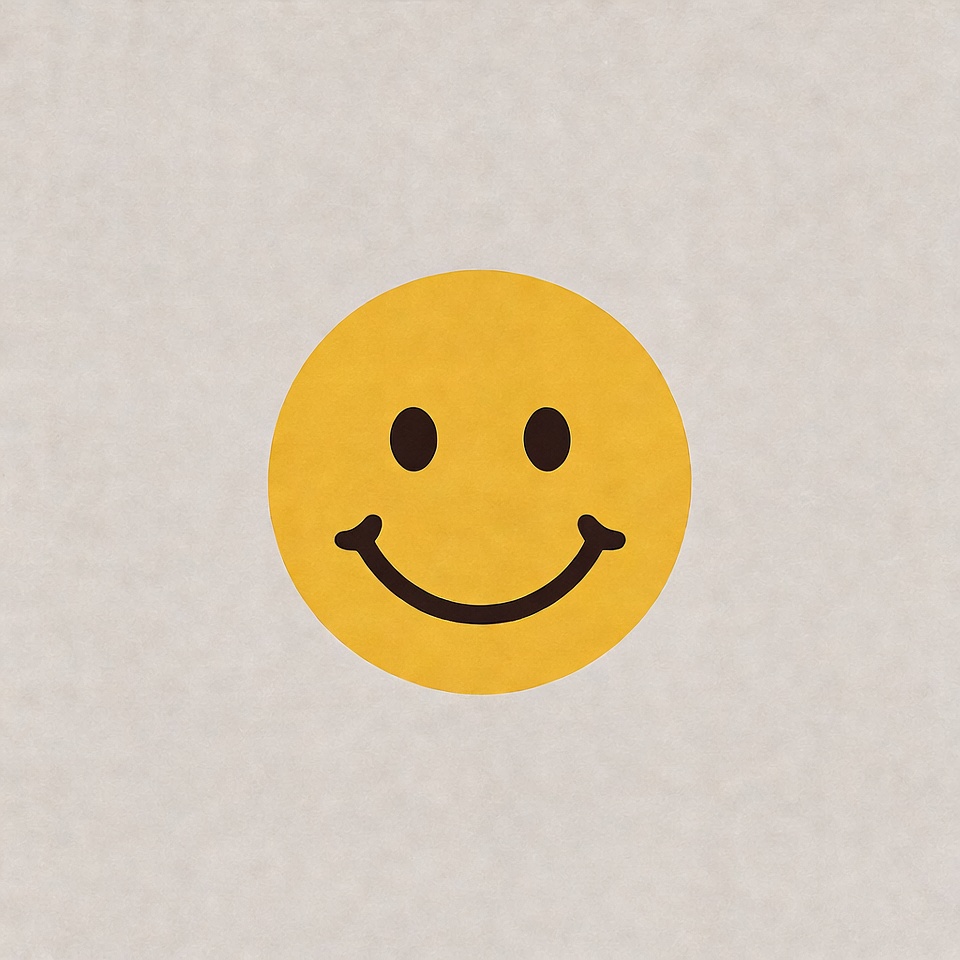 A bright yellow smiley face emoji features two black oval eyes and a wide curved smiling mouth. It is centered on a light beige background. The design is simple and bold with thick black outlines.