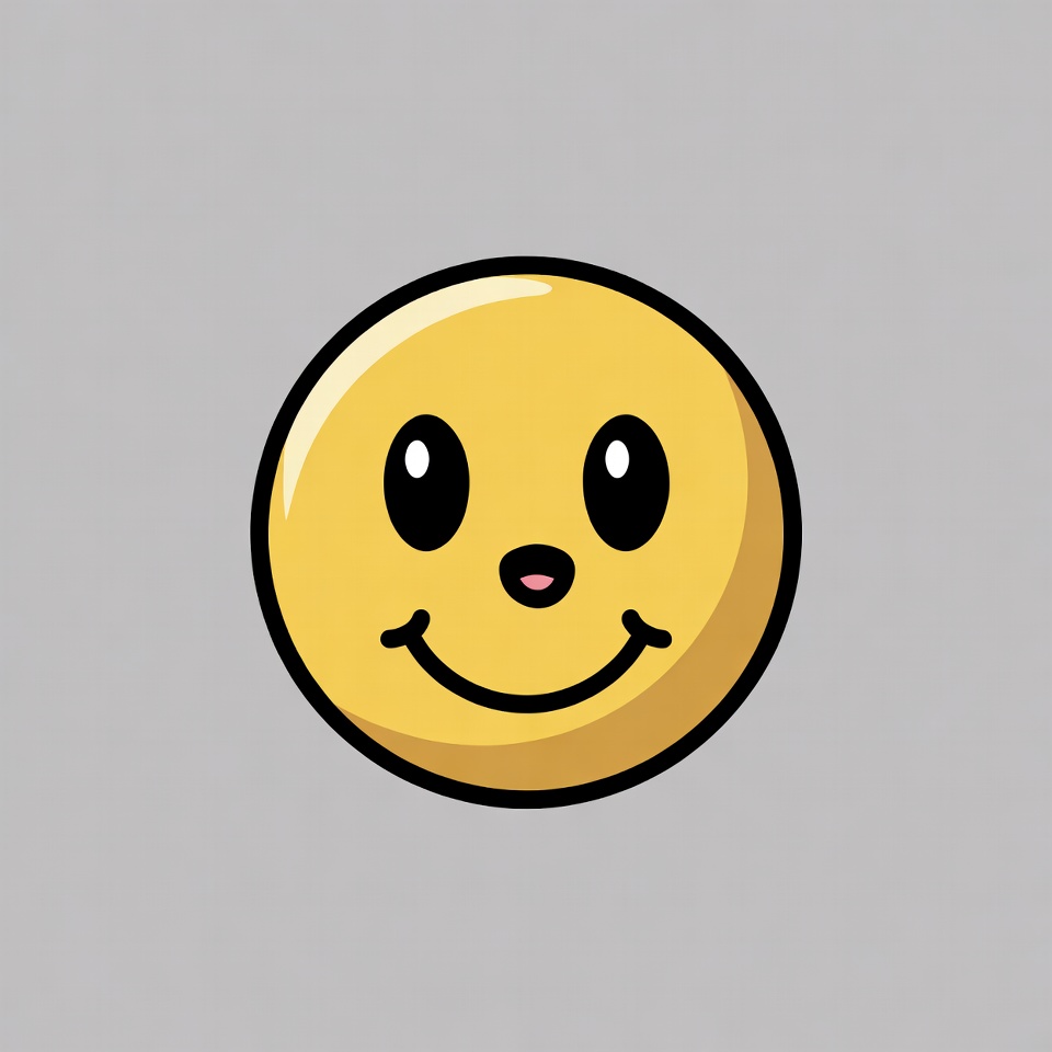 A bright yellow cartoon emoji with a cheerful smile on a gray background. It features large black eyes and a small pink nose. The glossy yellow circle has a simple, happy expression.