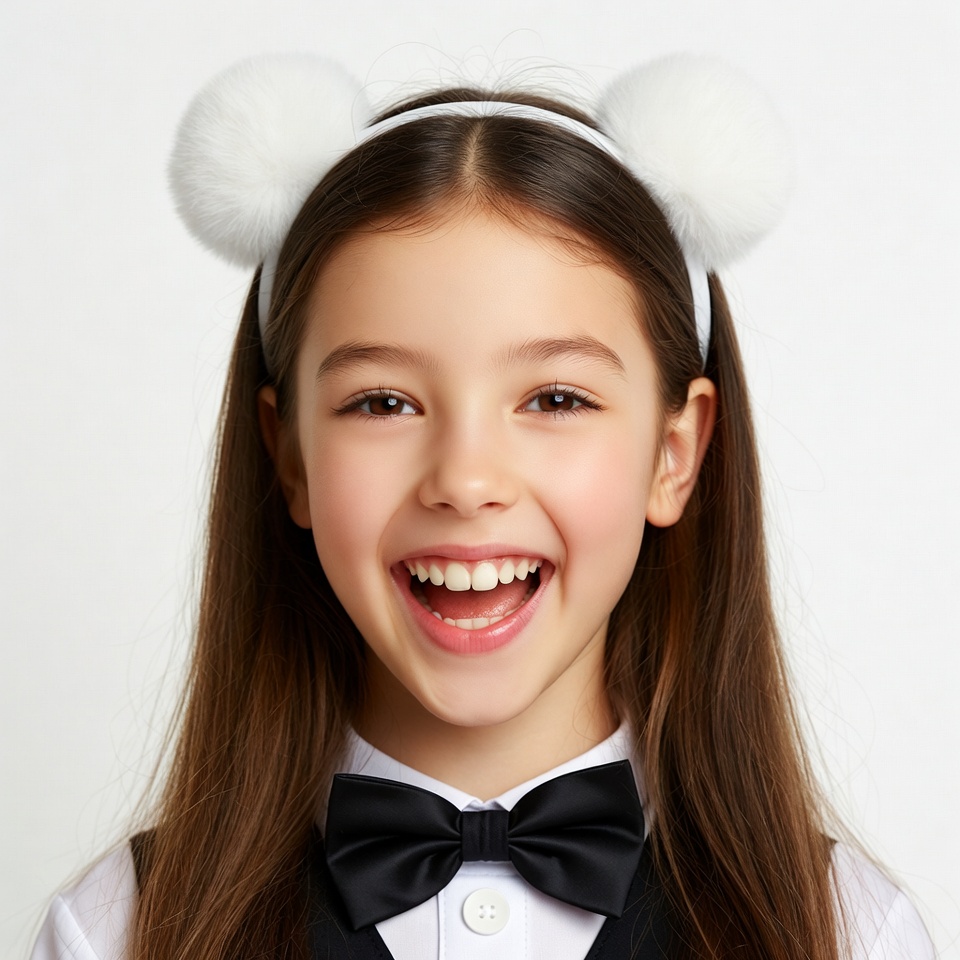 A young Asian girl with long dark hair and a white bunny ear headband smiles widely at the camera. She wears a white collared shirt with a black bow tie and vest. The image is isolated on a plain white background.