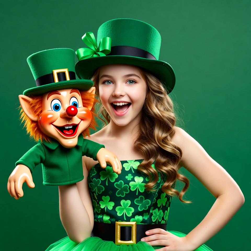 A smiling girl with wavy blonde hair holds a green leprechaun hand puppet on her arm. She wears a green top with shamrocks, a green tutu skirt with a gold buckle belt, and a large green top hat with a black band. Both are posed against a solid green background.