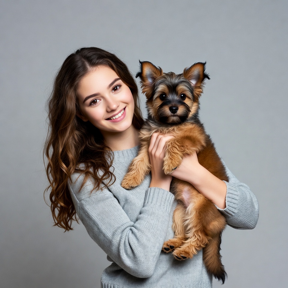 A young woman with long brown wavy hair smiles while holding a small Yorkshire Terrier puppy in her arms. She wears a light gray sweater and stands against a plain gray background. The fluffy puppy has tan and black fur with perky ears.