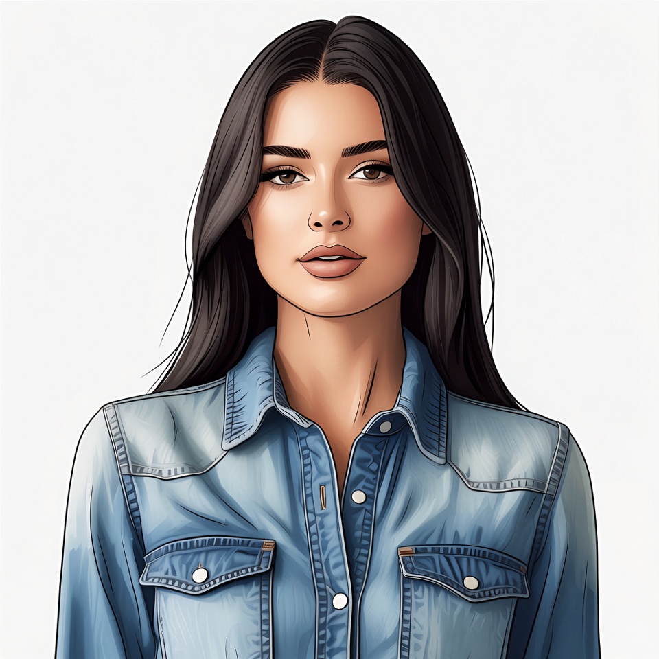 beautiful, blue denim, brown eyes, clipart, confident expression, dark hair, denim shirt, face, female, glossy lips, illustration, isolated background, long hair, makeup, portrait, young, woman