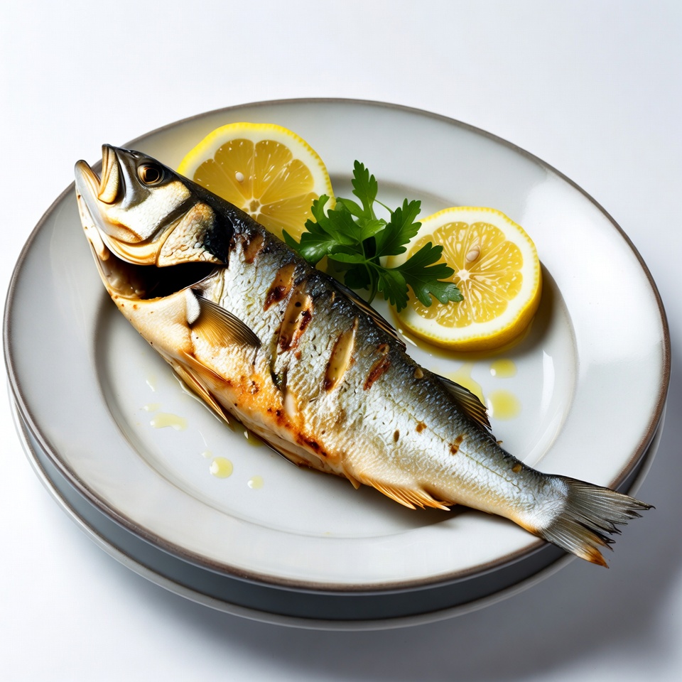 bass fish, cooked fish, cuisine, dinner plate, food photography, fresh lemon, fresh parsley, gourmet food, grilled sea bass, grilled seafood, healthy meal, isolated background, lemon garnish, lemon slices, parsley garnish, sea bass, seafood dish, white plate, whole fish, grilled fish