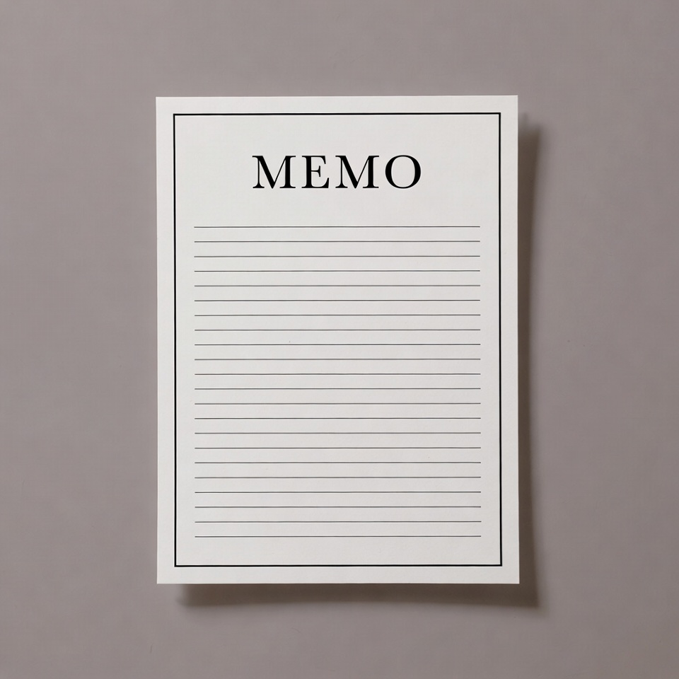 A white rectangular memo pad with a bold 'MEMO' title at the top and horizontal ruled lines below. It features a thin black border and is isolated against a light gray background. The pad appears clean and ready for writing.