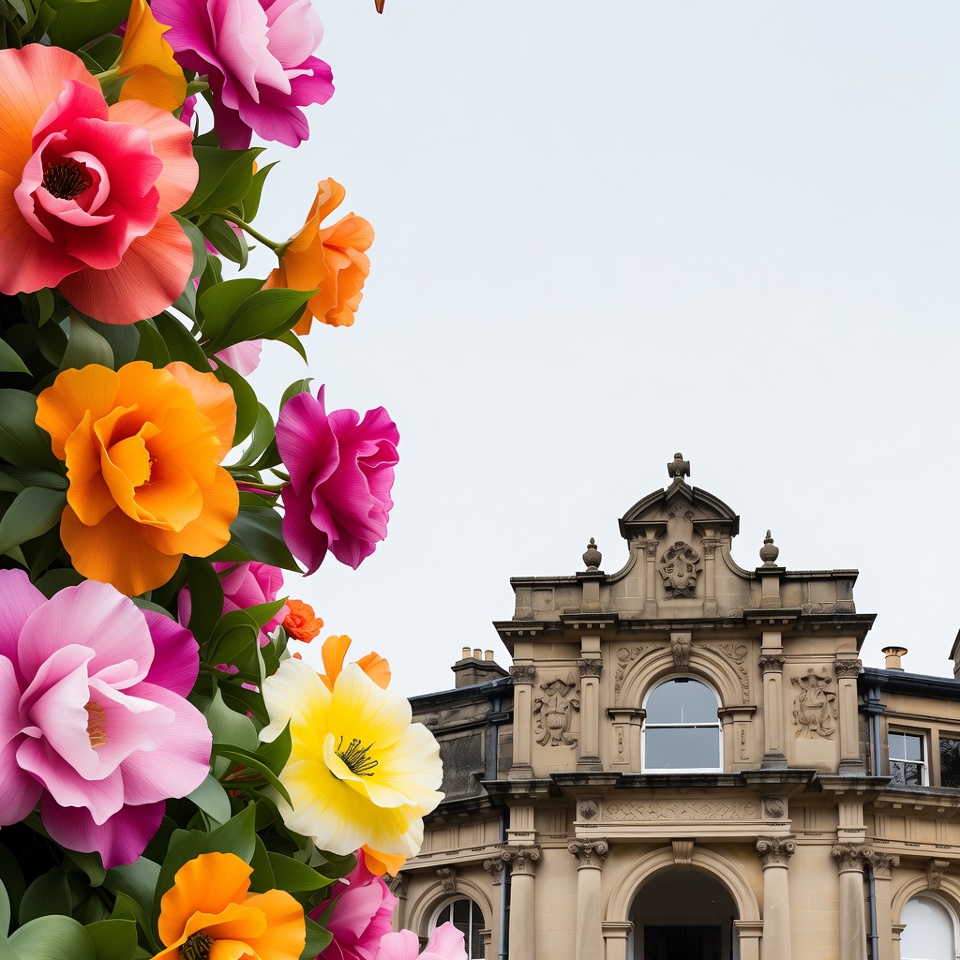 arched windows, architecture, artificial flowers, building exterior, clear sky, colorful flowers, cross spire, decorative architecture, floral arrangement, flower border, historic building, orange flowers, ornate facade, pink flowers, red flowers, stone building, urban flowers, vibrant blooms, yellow flowers, flowers