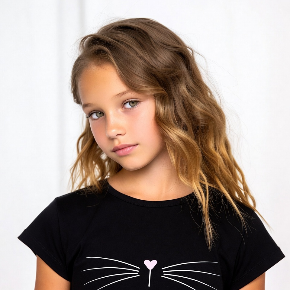 A young girl with long wavy brown hair looks at the camera with green eyes. She wears a black short-sleeved t-shirt featuring a white cat face and pink heart design. She stands against a plain white background.