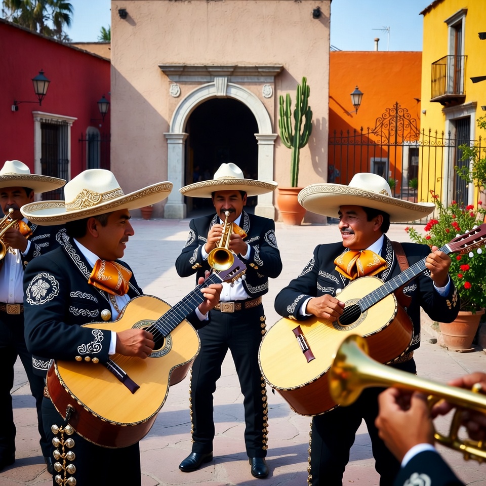 Latino, Mexican culture, Mexican men, adobe buildings, cacti, charro suits, colorful village, flowers, guitar, mariachi musicians, men, orange walls, playing music, potted plants, sombreros, street performance, sunny day, traditional attire, trumpets, mariachi band
