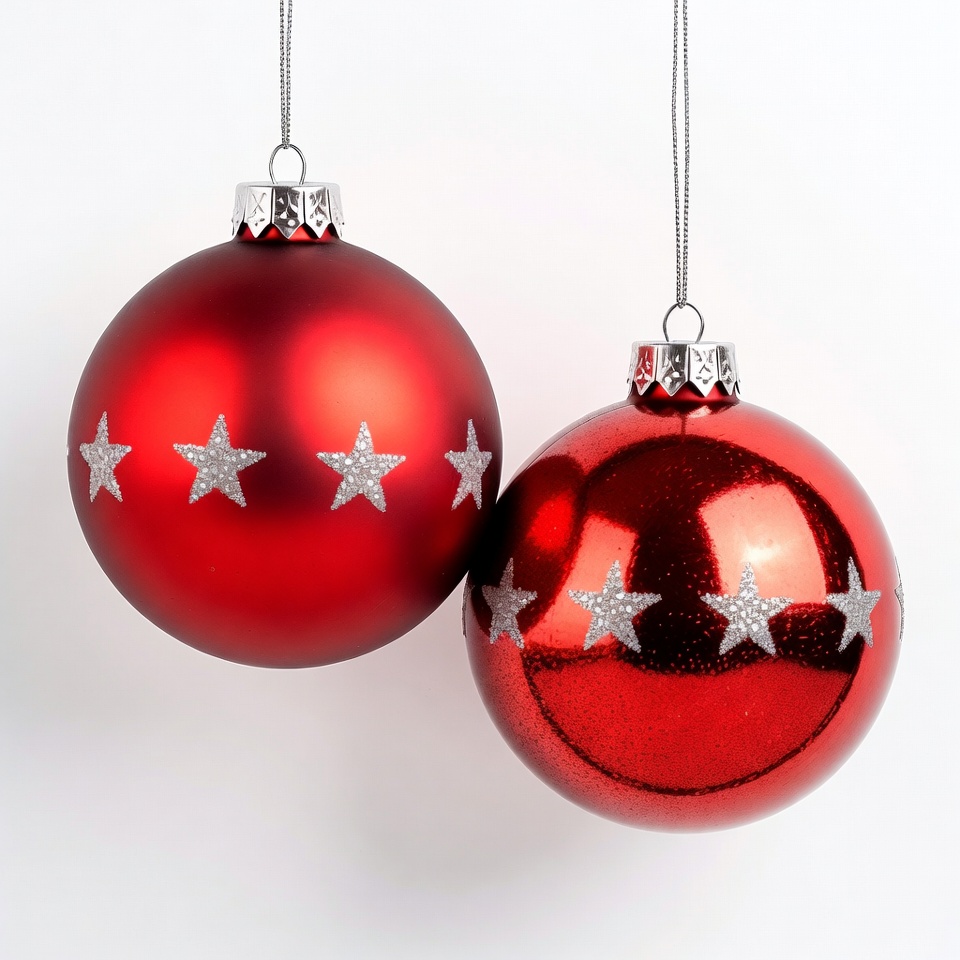 Christmas balls, Christmas decor, festive decor, glossy finish, hanging ornaments, holiday balls, holiday decorations, isolated, metallic stars, red baubles, red ornaments, shiny baubles, silver stars, star patterns, white background, Christmas ornaments