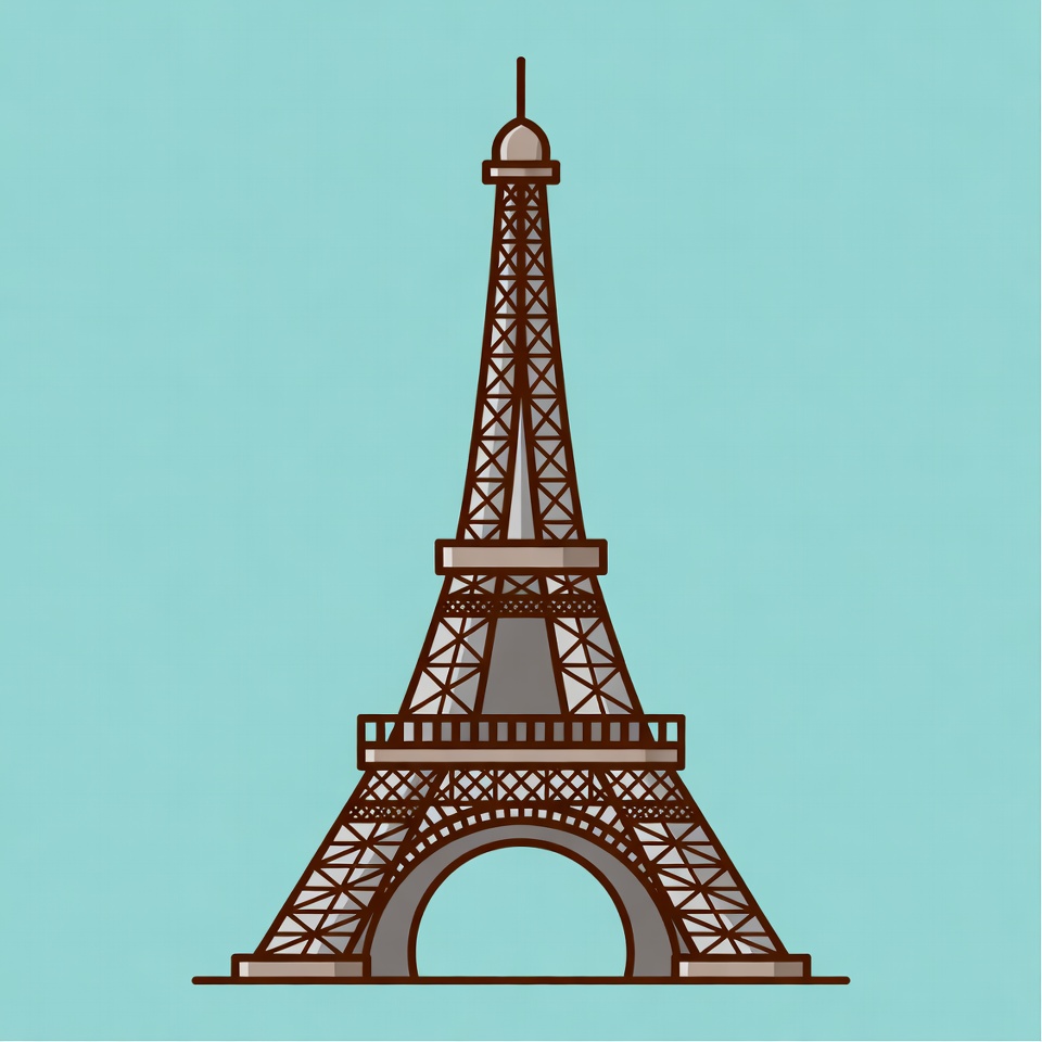 A simple line art illustration of the Eiffel Tower stands tall against a solid light blue background. The tower features brown outlines and gray shading on its lattice structure, with a prominent arch at the base. It is depicted in a flat, cartoonish style with clean lines and minimal details.