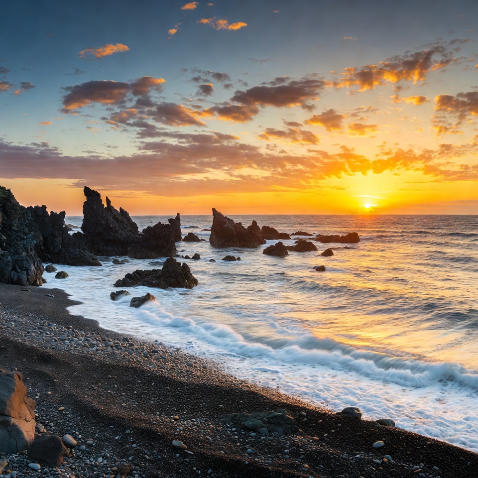 A vibrant sunset illuminates the ocean horizon with orange and pink hues above scattered dark rock formations. Waves gently crash onto a black sand beach lined with rugged volcanic rocks. The sky is adorned with scattered clouds reflecting the warm golden light.