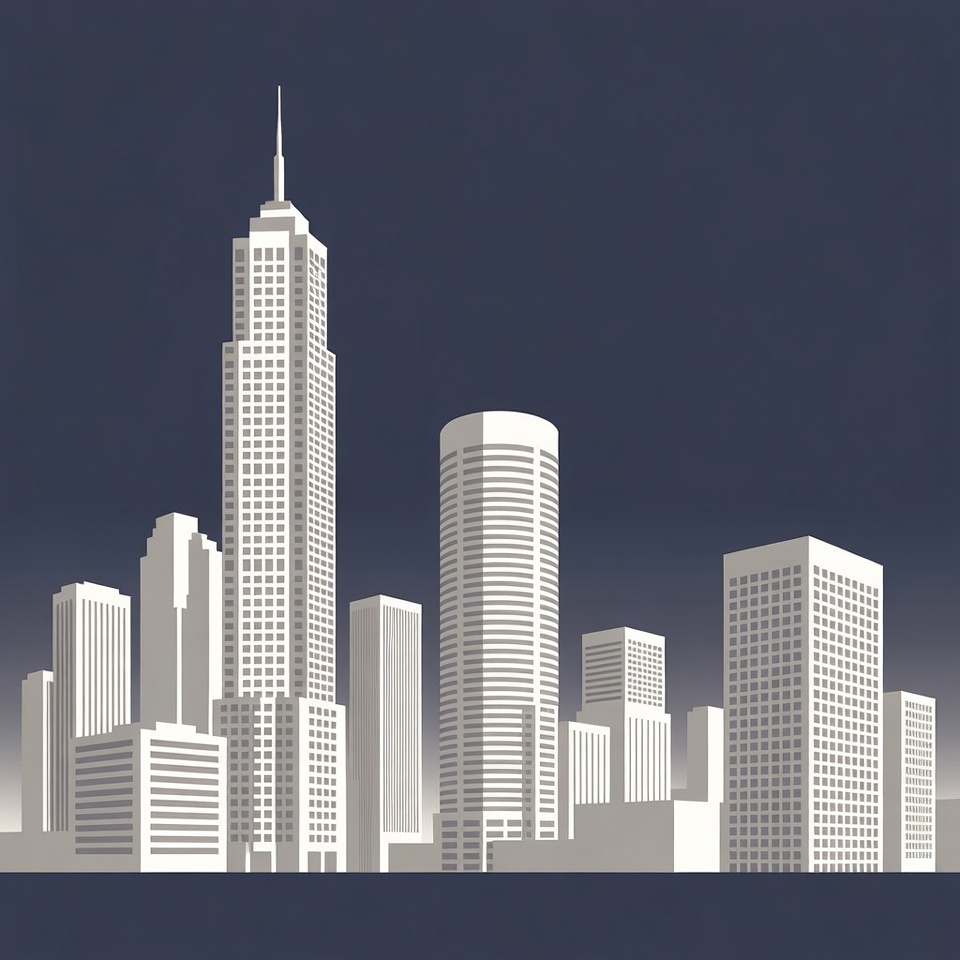 art deco building, cityscape, clipart, dark background, high-rise buildings, isolated background, minimalist design, modern architecture, navy blue, silhouette, skyscrapers, tall towers, urban skyline, vector illustration, white buildings, city skyline