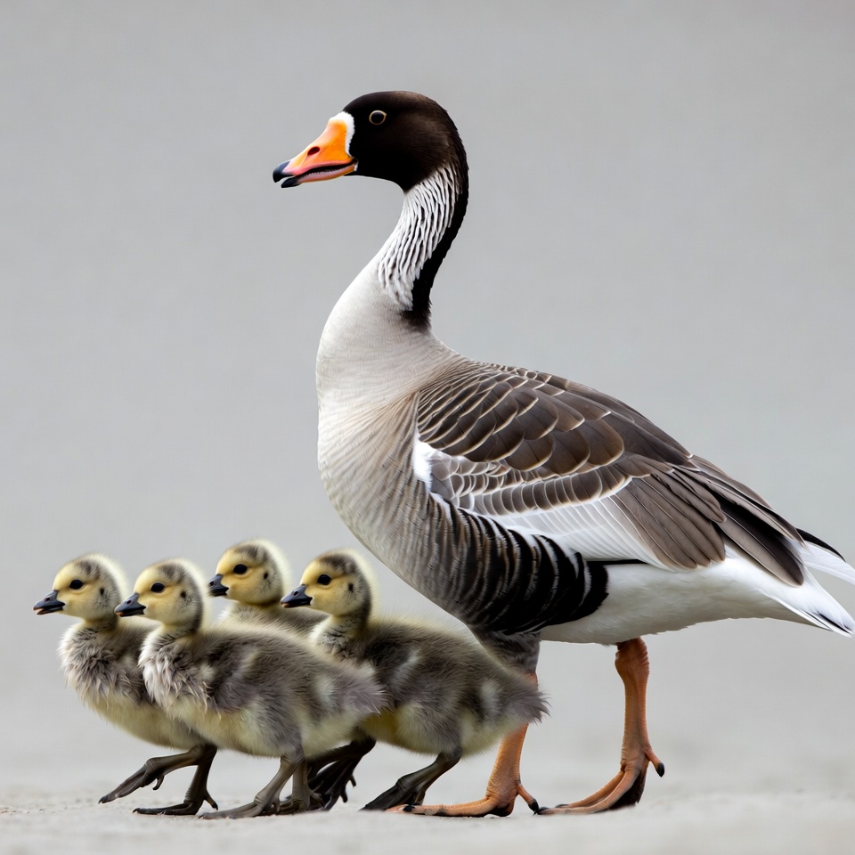 A large adult goose with a white body, brown head, and orange beak stands protectively with five fluffy yellow goslings gathered around its feet. The group is positioned on a plain gray background, highlighting their feathers and postures. The goslings huddle closely together behind the mother goose.