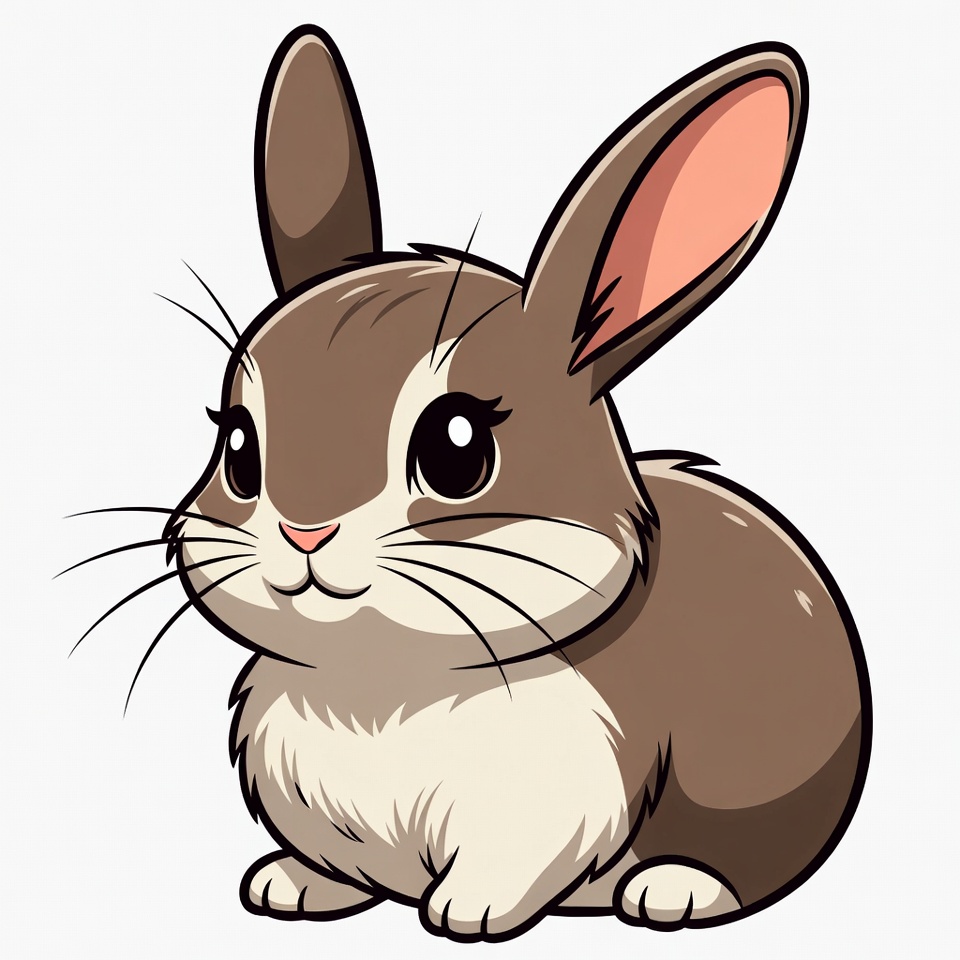 A cute cartoon bunny with brown fur and white underbelly sits on a white background. It has large expressive eyes, long floppy ears with pink insides, and a small pink nose. The chibi-style illustration features fluffy details and whiskers.