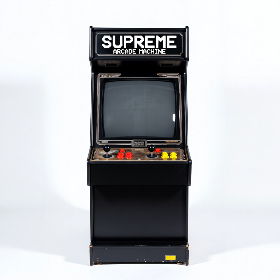 80s arcade, CRT screen, Supreme, black cabinet, coin slot, gaming cabinet, isolated background, joysticks, red buttons, retro arcade, upright cabinet, vintage gaming, yellow buttons, arcade machine