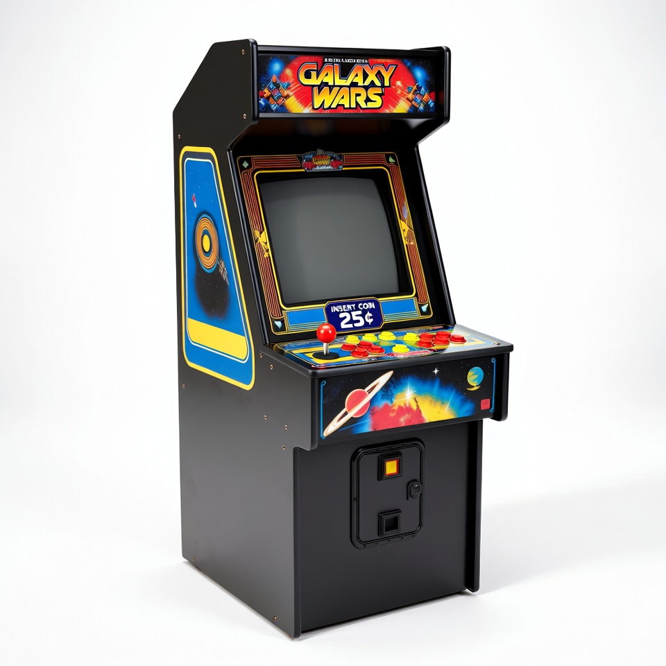 25 cents, CRT screen, Galaxy Wars, black cabinet, classic arcade, coin operated, gaming cabinet, insert coin, isolated background, joystick, planets, retro arcade, space game, stars, video game, arcade machine