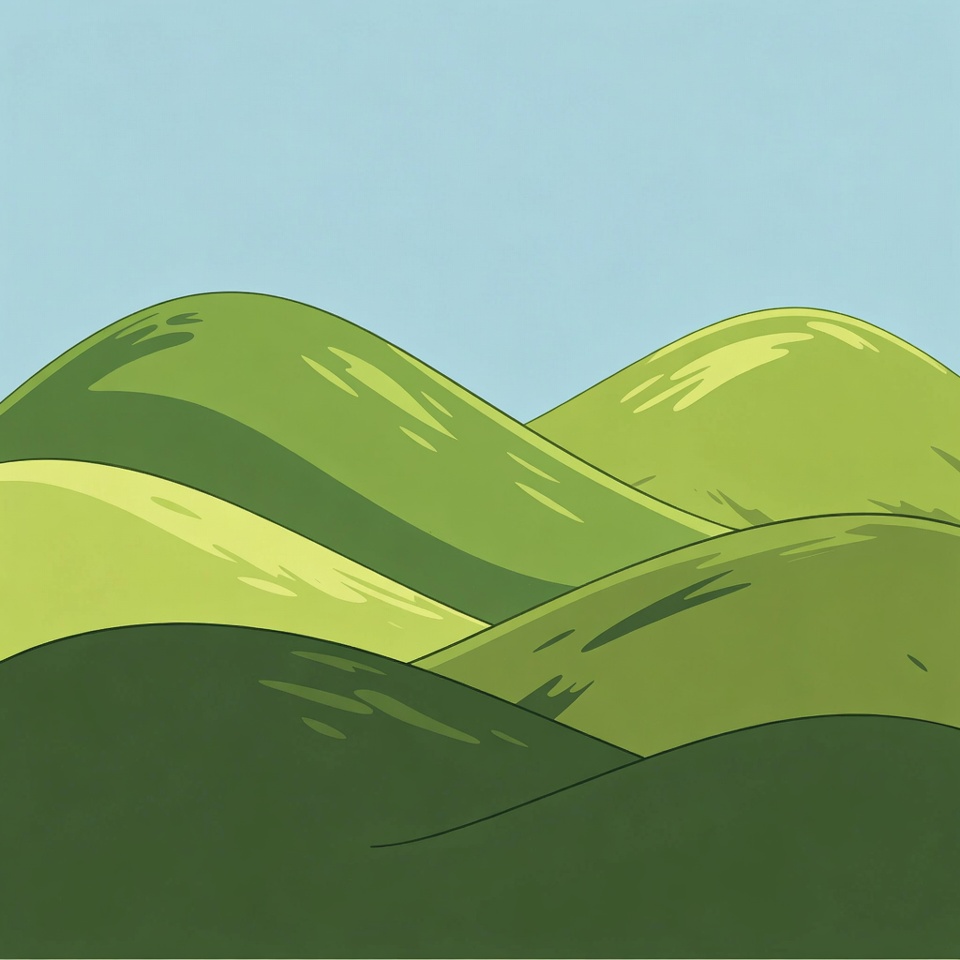 A colorful illustration features multiple green hills with varying shades rising against a clear blue sky. The hills are depicted in a simple, cartoonish style with smooth, curved outlines and subtle shading. The background is isolated and vibrant.