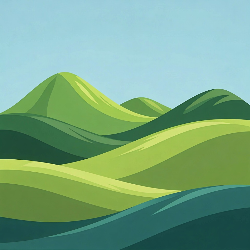 background, blue sky, clipart, digital art, environment, flat design, hills, illustration, landscape, mountains, nature, outdoor, peaks, scenery, simple illustration, stylized landscape, teal hills, vector art, vibrant colors, wavy hills, green mountains