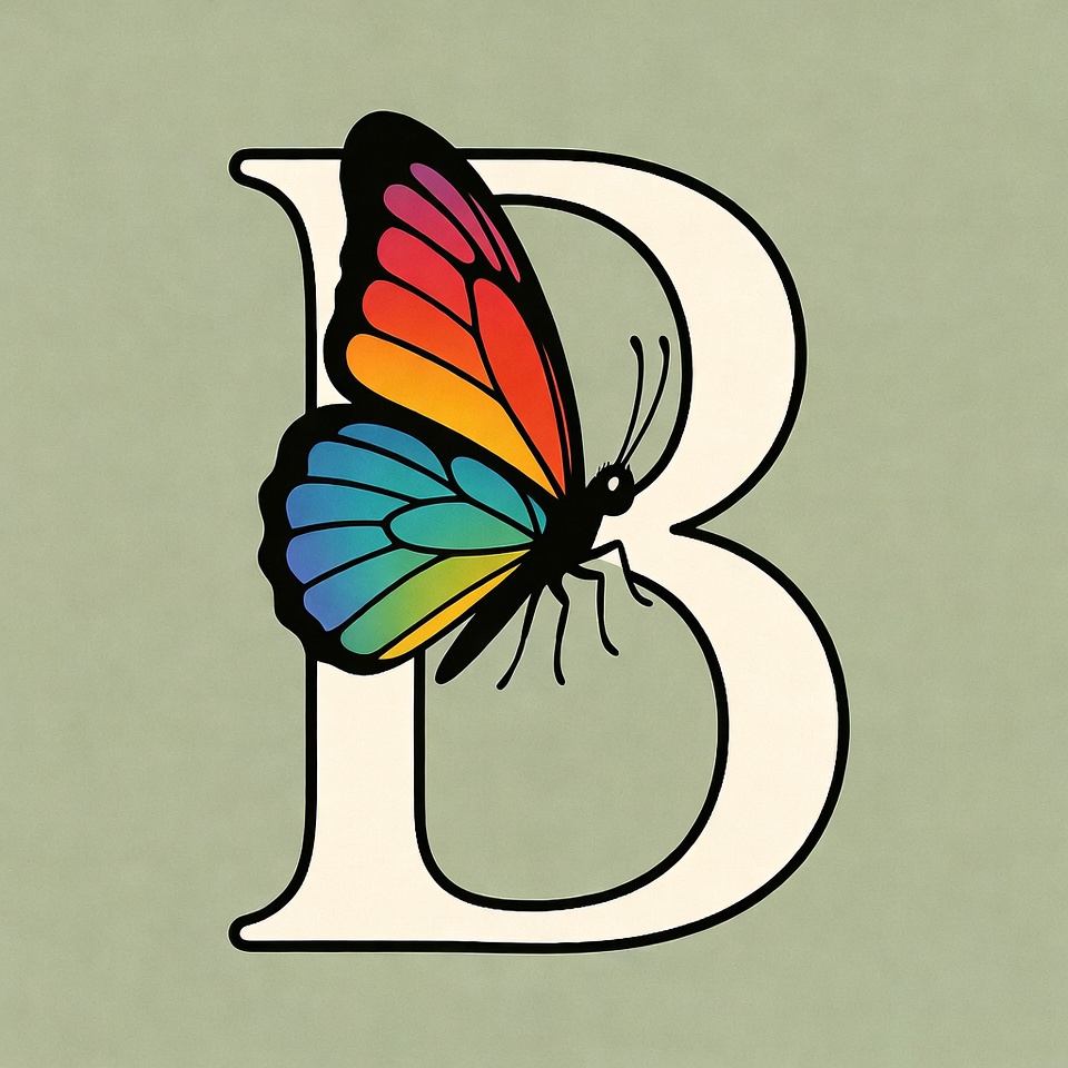 A vibrant rainbow-colored butterfly perches on a large white outline letter B. The illustration features detailed wings in red, orange, yellow, green, blue, and purple hues. It is set against a light green background.