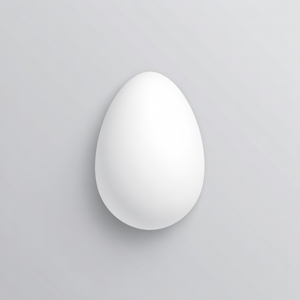 A smooth white egg is centered on a light gray background. It features a realistic 3D rendered appearance with subtle shading and highlights. The egg is isolated with ample negative space around it.