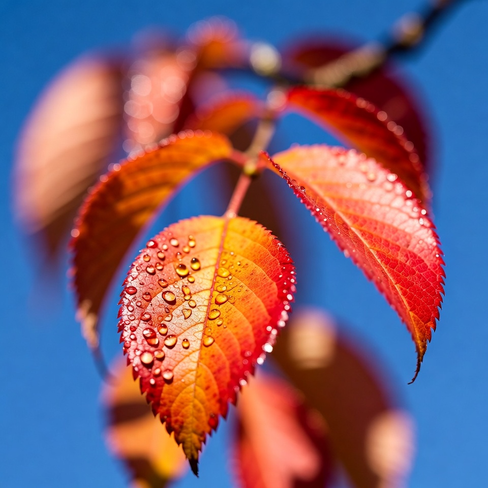 autumn colors, blue sky, branch, closeup, dew drops, fall foliage, foliage, glistening drops, leaf texture, macro photography, nature, orange leaves, outdoors, plant, red leaves, seasonal, serrated edges, vibrant colors, water droplets, autumn leaves