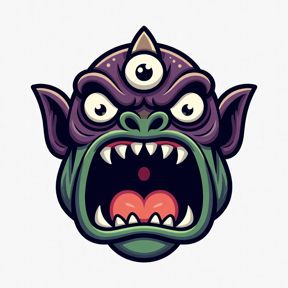 A fierce green goblin monster with purple skin accents and a horned helmet faces forward on an isolated white background. It has three bulging eyes, pointed ears, and a wide-open mouth revealing sharp fangs and a red tongue. The cartoonish illustration features bold outlines and vibrant colors.