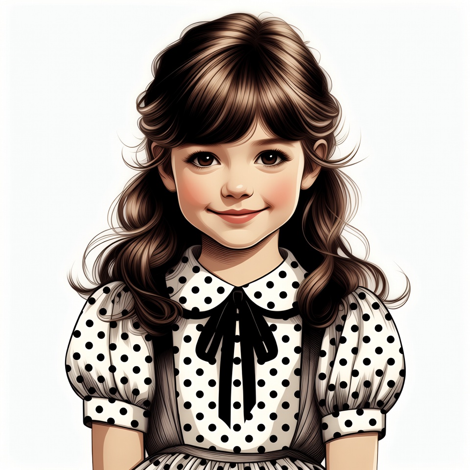 A young girl with long wavy brown hair smiles happily at the viewer. She wears a white polka dot dress with puffed sleeves and a black bow collar. The illustration features her against a plain white background.