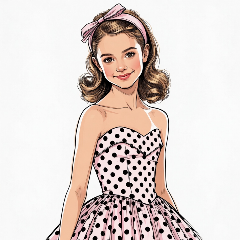 An illustration of a young girl with wavy brown hair and a pink headband smiles at the viewer. She wears a strapless pink dress covered in white polka dots with a full skirt. The image is set against a white isolated background.