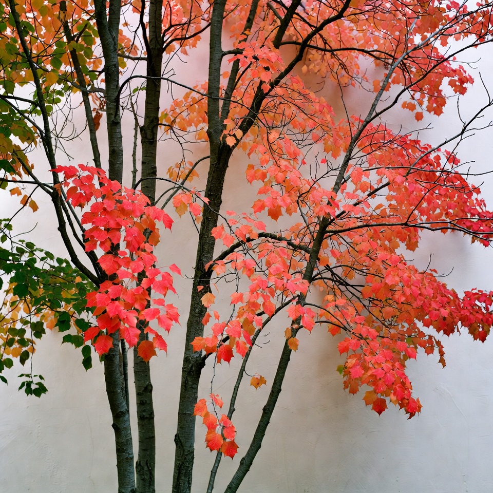 autumn colors, branches, fall leaves, foliage, leaf clusters, maple tree, nature, orange leaves, outdoors, red leaves, seasonal change, tree bark, vibrant colors, white wall, yellow leaves, autumn tree
