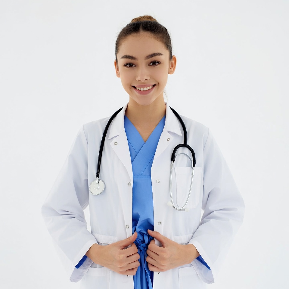 A young Asian woman wearing a white lab coat over a blue scrub top stands smiling at the camera. She has her dark hair in a neat bun and a stethoscope draped around her neck. Her hands are clasped in front of her against an isolated white background.