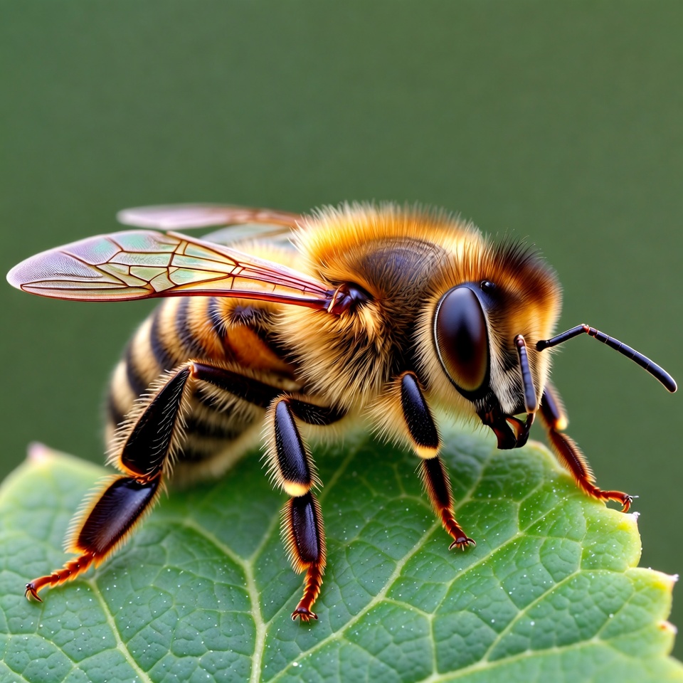 A detailed honey bee with orange and black stripes sits on a large green leaf. Its translucent wings are spread slightly, and large compound eyes are prominent. Fine hairs cover its body, and legs grip the leaf surface.