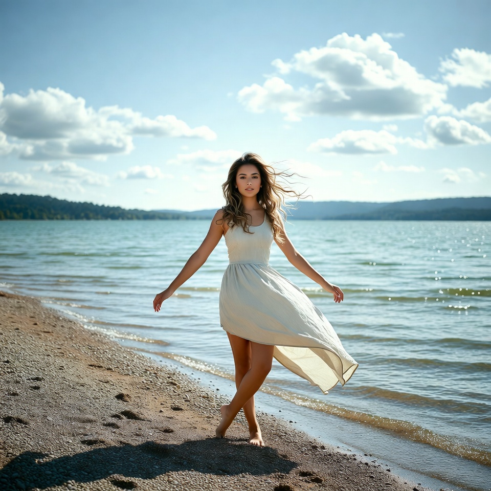 A young woman with long wavy brown hair wears a sleeveless white dress that flows in the wind while standing barefoot on a sandy beach. She poses gracefully with arms outstretched near the edge of a calm lake under a partly cloudy blue sky. Distant forested hills are visible across the water.