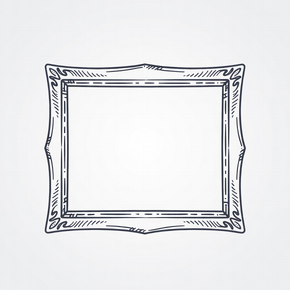A detailed line drawing of an empty picture frame with intricate ornamental edges. The frame features curved and pointed designs in a vintage style. It is isolated on a white background.