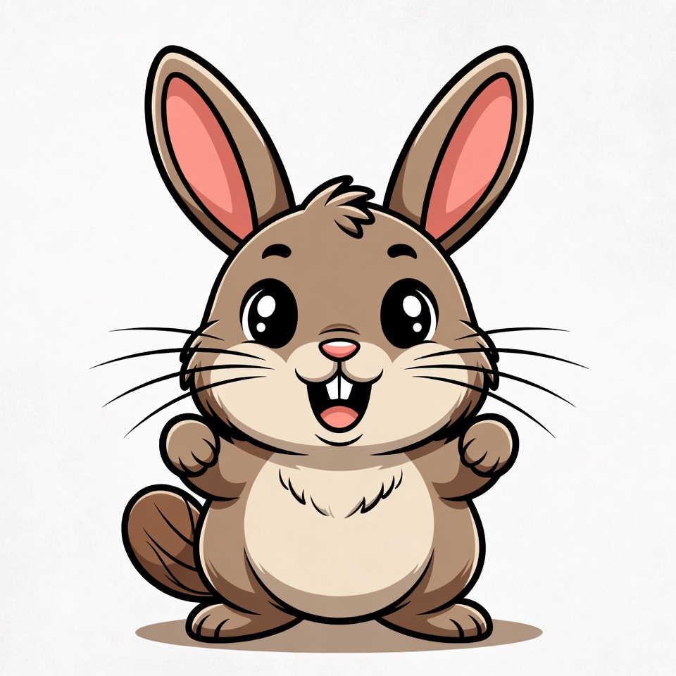 A cute cartoon bunny with large pink ears and big sparkling eyes stands happily with paws raised. It has brown fur, a fluffy tail, and a wide smiling mouth showing teeth. The illustration features a simple isolated background.