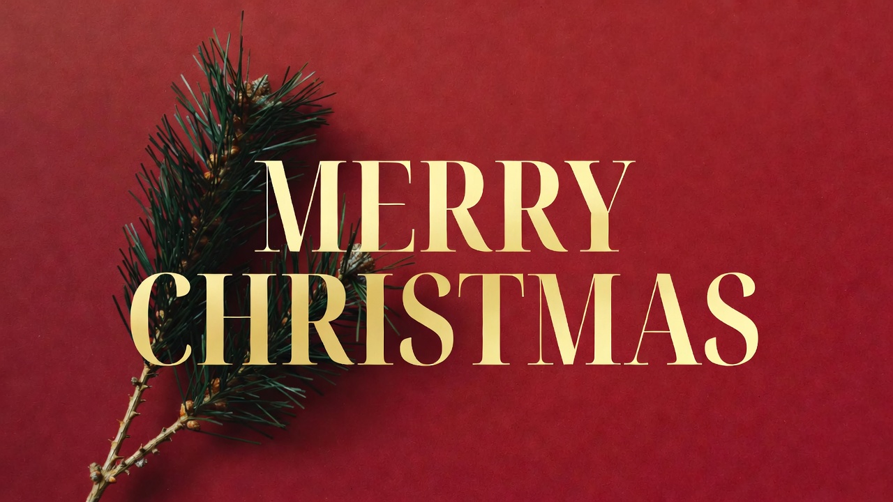 Golden 'Merry Christmas' text is prominently displayed on a vibrant red background. A fresh green pine sprig with branches is positioned on the left side. The design features a festive holiday graphic with elegant typography.