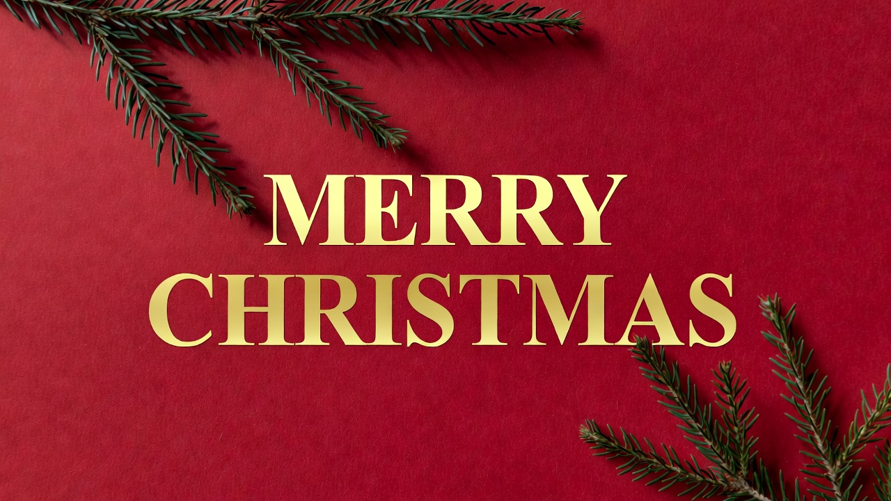 Christmas banner, Christmas decoration, Christmas graphic, Christmas greeting, Christmas image, evergreen branches, festive design, fir branches, gold text, holiday card, holiday text, pine branches, red background, seasonal greeting, Merry Christmas