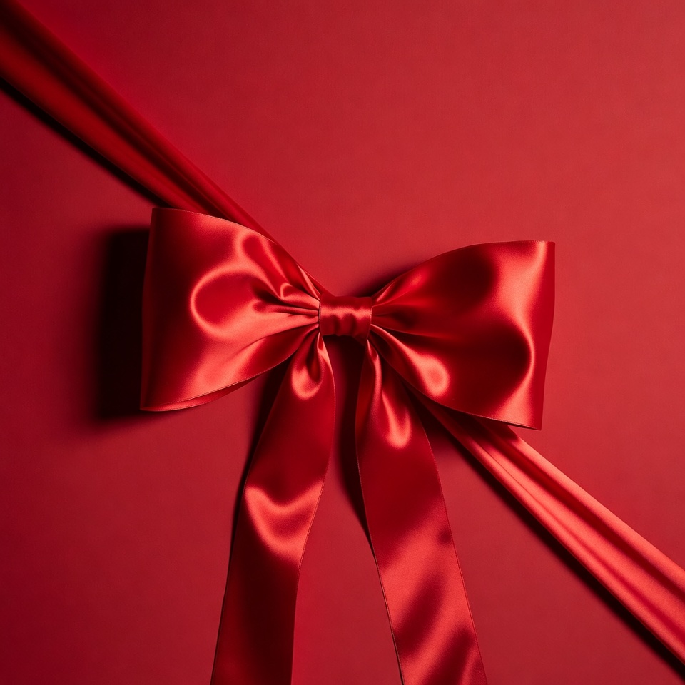 A large red satin bow sits prominently on a solid red background. Shiny ribbons drape from the bow, creating elegant folds and curves. The glossy fabric reflects light, emphasizing its luxurious texture.
