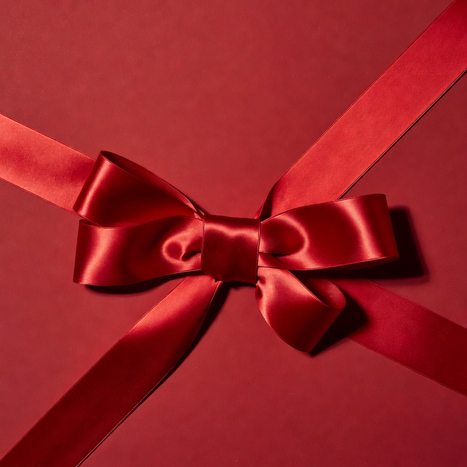 A vibrant red gift box is wrapped with glossy red satin ribbon crossed in an X pattern. A large, intricately folded satin bow sits prominently in the center. The image features a close-up view on a solid red background.