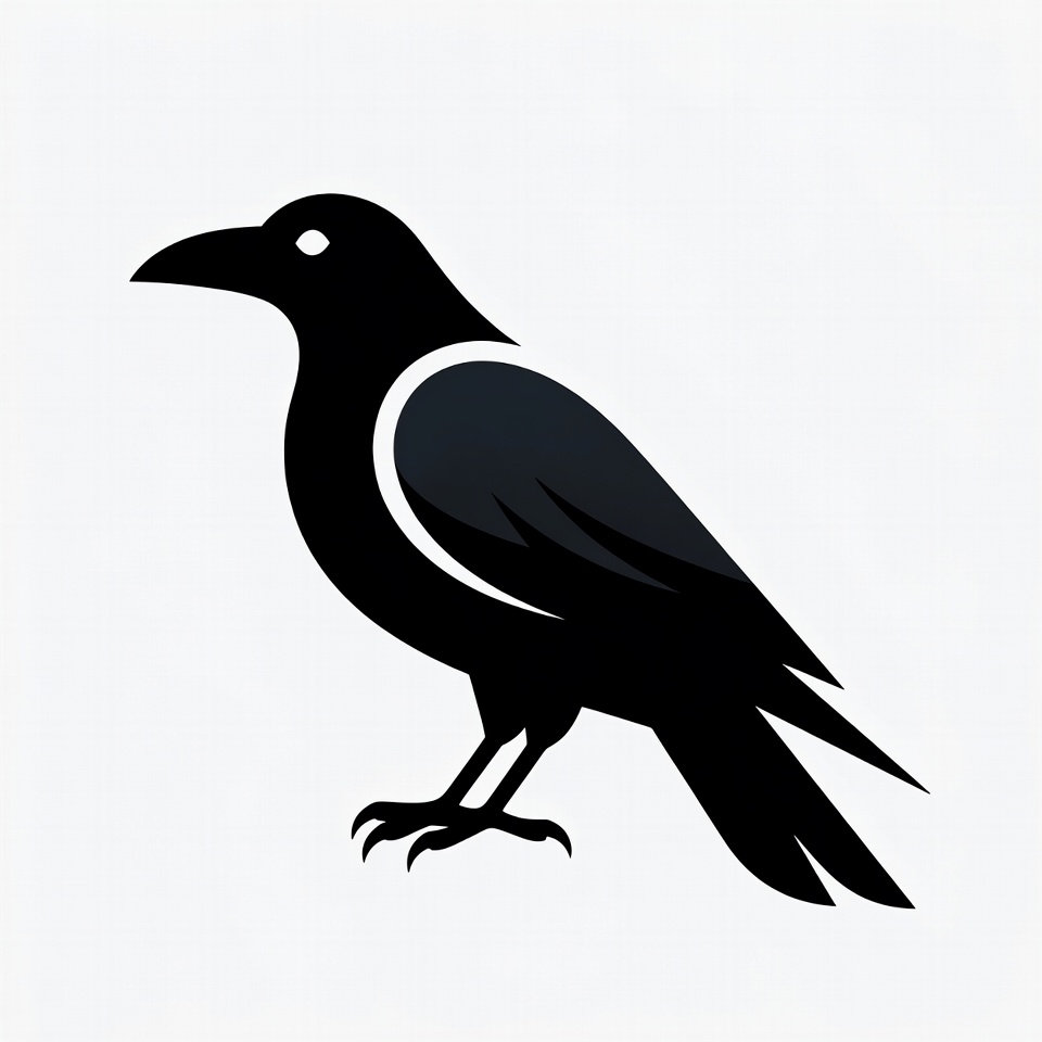 A black silhouette illustration of a crow stands on one leg against a white background. The bird features a sharp beak, detailed feathers on the wings and tail, and white outlines accentuating its form. It faces to the right in a classic profile view.