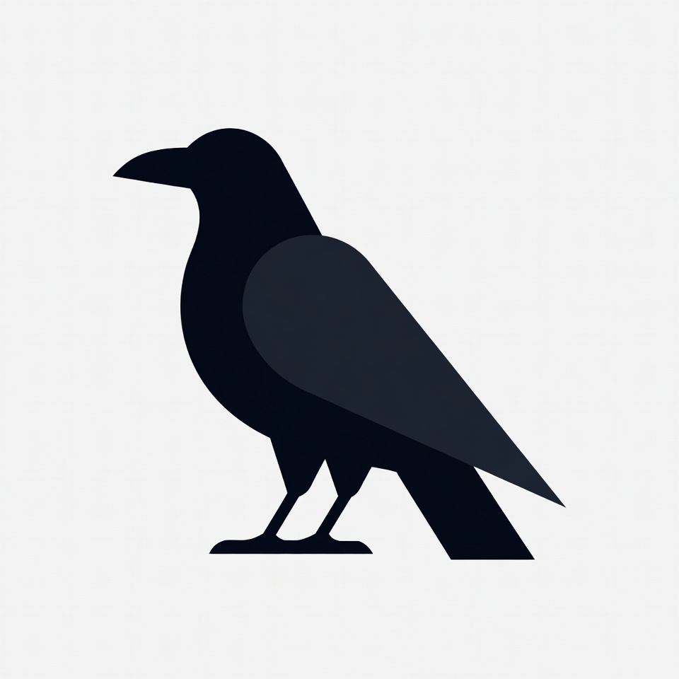 A simple black silhouette illustration of a crow stands on one leg. The bird features a curved beak, detailed feathers on the wings and tail, and is set against a white background. The design is minimalist and isolated.